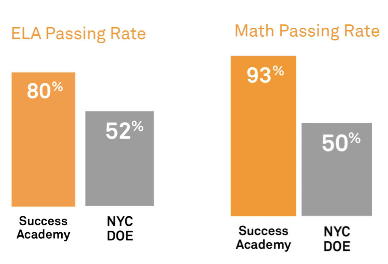 In stark contrast, Success Academy, a charter school in Harlem, boasts that 98% of its students scored at or above the proficient level in both math and reading. How is this possible? Charter schools enjoy advantages over traditional public schools that significantly contribute to their higher test scores. They have the flexibility to tailor curriculum and teaching methods to meet student needs, fostering an environment where educators can implement better practices and respond swiftly to academic challenges. (Continued under graph)